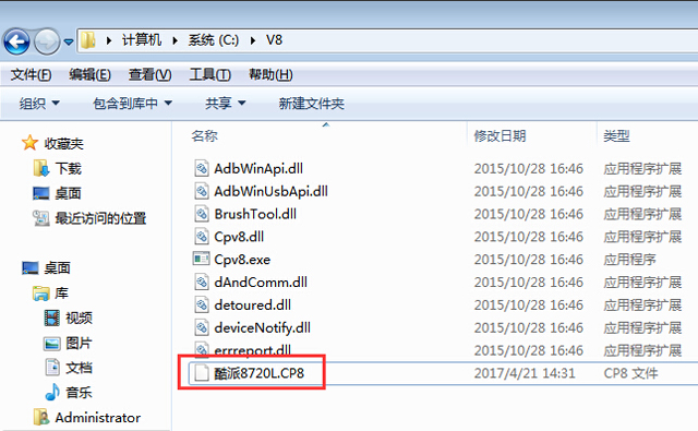 三、开始刷机 1、将下载的V8解压缩,然后移动到C盘下(最好是C盘根目录),然后将刷机包也放到V8的文件夹(CP8的文件)