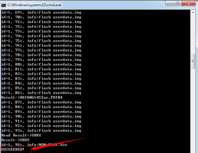 7、直到界面显示succeeded,表示刷机成功了,手机会自动关机。
